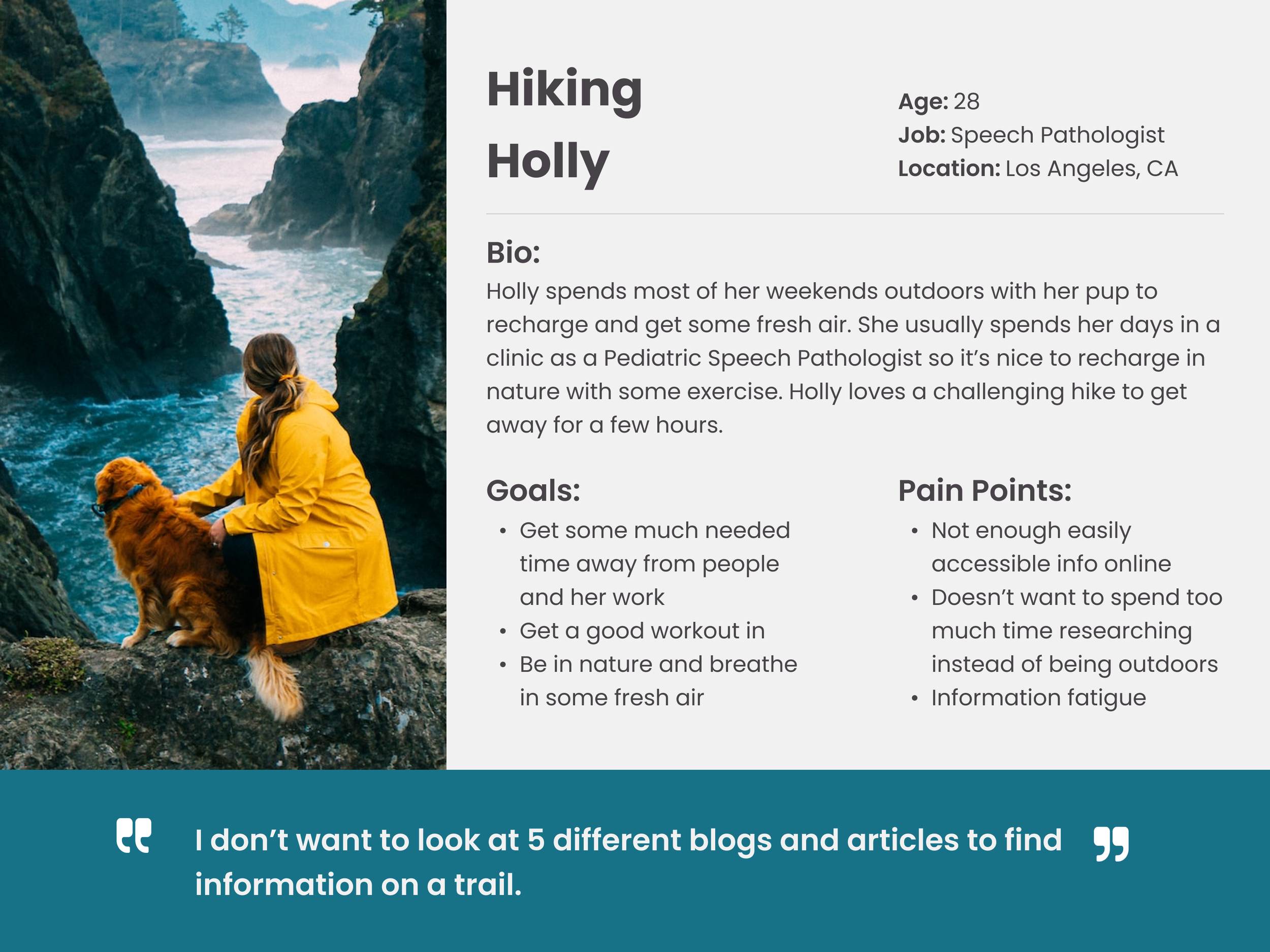 Hiking should be a fun and adventurous experience, but the research process can often be challenging and time consuming. We already spend so much time looking at screens during the week for work, so getting outdoors for a hike should be an easy and seamless process. Happy Hiker exists to simplify the hiking experience by creating an all in one platform that provides comprehensive trail information.